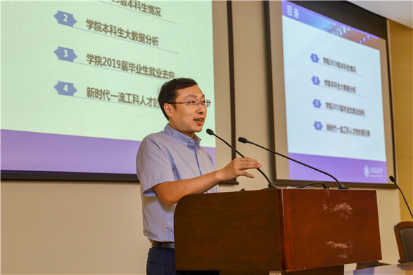 张文明以“新时代一流工科人才的价值引领”为题做了主题报告。他首先介绍了2019级本科新生概况、本科生班主任团队与教务管理团队。之后开展了学院本科生大数据分析,介绍了往年本科生的学业情况与毕业去向、就业单位情况等。以许多本科优秀毕业生为例,希望家长鼓励学生有更高的学术追求。他着眼于“本科生价值引领”,向家长介绍了一流工科人才应具备的素质和学院本科生的评价体系。最后,他呼吁家长们鼓励孩子提高适应能力与学院联合做到合力育人,培养具有崇高理想、正确价值、国际视野的一流工科创新人才。