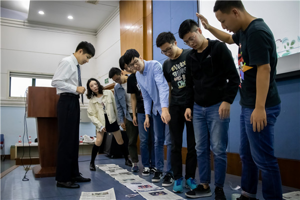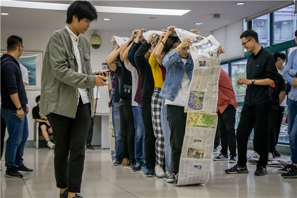 随后进行的是“无敌风火轮”游戏,游戏要求用报纸、剪刀等道具制作一个可供团队所有同学行进的“风火轮”,在行进过程中,团队同学的手脚不能离开报纸。在总结环节,王文章带领大家就风火轮游戏中出现的问题,进行了深刻的讨论,让大家懂得了团队成员的正确分工与有效协作的重要性。