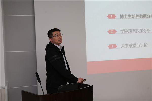 熊振华首先汇报了学院博士生培养工作。他通过详实的历史数据,对比分析了博士生不同培养方式、学科、系所、导师的培养周期和论文成果。他认为,应以大数据为依据有针对性地出台相应的政策,从而缩短博士生培养年限、提高博士生培养质量。他提出通过建设学院砺远菁英会来完善博士生荣誉计划的方案,同时要加强博士生开题和中期的统一考核,完善资格考试和分流淘汰机制,逐渐实现博士生培养从按时向按质的转变。