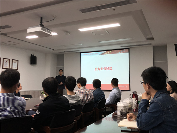 王文章向班主任介绍F18级专业分流情况、按专业重新分班原则以及初步安排。分析了F18级高等数学期中考试成绩,提醒各班主任重点关注班级分数较低同学,帮助同学尽快调整学习状态。王文章还通报了家庭经济困难生认定、社会实践等年级工作。
