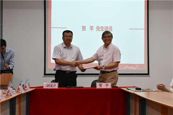 顾希垚代表学校聘请贺平先生为“贺彭年班”校外班主任,为其佩戴校徽并赠送礼物。