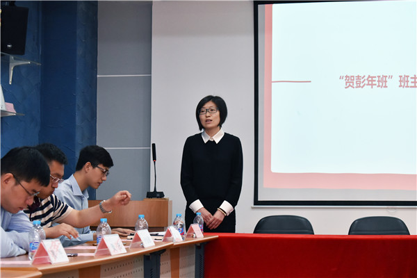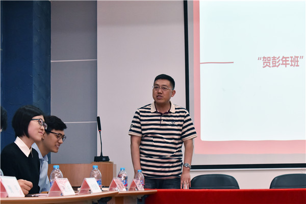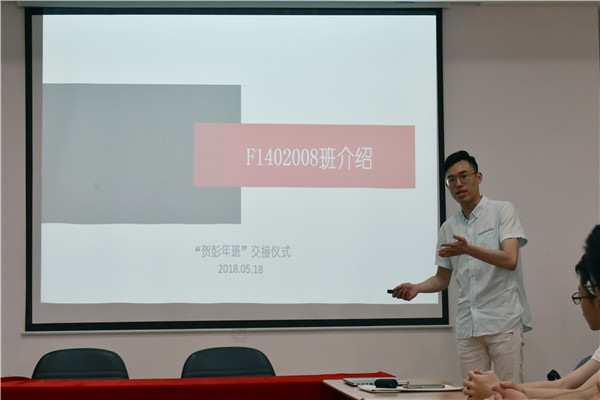 F1402008班“贺彭年班”学生代表吴锦超从班级活动、班级荣誉和毕业去向等五个部分进行了成果介绍,为17级“贺彭年班”树立了良好的榜样。