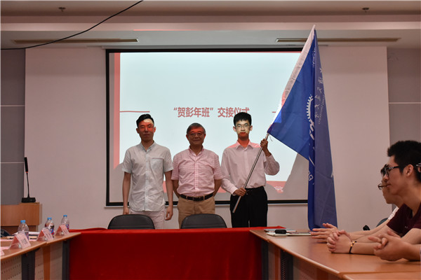 贺平将代表“贺彭年班”的班级旗帜从F1402008班交接到F1702114班手中,旗帜的交接代表着贺学长精神的传承。