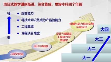 为培养适合我国未来产业需求及国家重大战略的创新型工科人才,同时针对机械工程教育体系与产业变革和科技进步需求相脱节的问题,从2010年开始,探索以项目式教学为牵引的教学模式改革,将项目式教学方式与国际产学合作引入到四年本科课程教学中,主要围绕《工程学导论》、《设计与制造I》、《设计与制造II》、《热力系统设计与实践》以及《毕业设计》等课程培养目标,征集并遴选来源于企业的热点研究问题、导师命题及学生自选发明,以学生团队合作方式,在任课教师和企业专家指导下,完成从市场调研、概念设计到样机制作与测试、技术经济分析、项目总结等的工程项目实践过程。自2012年起每学期组织举办“课程项目成果展”,通过邀请行业企业专家对项目成果进行评审及指导,使学生的主动实践能力、创新精神和职业素养在循序渐进的实践环节中不断得到提高和加强,形成了校企专家与学生之间相互学习、相互启发的 “多赢”局面。