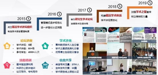 营造浓郁的研究生学术氛围,自2018年1月起大力推进砺远研究生学术体系常态化建设。一方面与学科发展相结合,每年举办8-10场主题学术论坛,结合青年教师“思·源”论坛和各系所特邀专家学术报告,提升研究生的学术视野、科研能力和表达能力,2019年研究生学术活动共覆盖四千余人次,91名博士生参与学术成果宣讲。另一方面完善研究生学术报告认证制度,制定出台《博士生学术活动管理规定》,通过入学教育、年级大会等活动全过程把握博士生学术引领灌浆期和成长期。截止目前,共有7名博士生获校学术之星、9名博士生获提名奖。自2017年起举办院级“学术之星”评选活动(全校唯一),通过评选活动、分享交流沙龙、系列宣传报道等途径强化优秀研究生的榜样引领、朋辈激励作用,积极推动高水平博士就业。