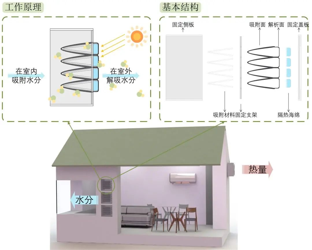 我国南方城市全年湿度较高,高湿环境不仅影响人体舒适感,还会影响空气品质,导致疾病风险的增大。在广泛的除湿需求下,当前主流的湿度控制技术能耗较高,其能耗约占全球每年总能耗中的8%。而本项目所制造的吸附除湿窗完全由太阳能驱动,由高太阳能吸收、低导热和亲水型多孔材料复合吸湿盐溶液制成。通过光热局部加热产生的温度梯度,实现在室外解吸水与室内吸附水,并利用溶液浓度梯度与毛细力将水分定向送至室外,实现连续除湿过程。使用本项目所制造的除湿窗除湿时,不仅能起到湿度控制的作用,还能够在使用家用空调时,承担其能耗中40%的潜热负荷,减少电能耗用的同时对环境无污染物排放,对节能减排具有重要意义。
