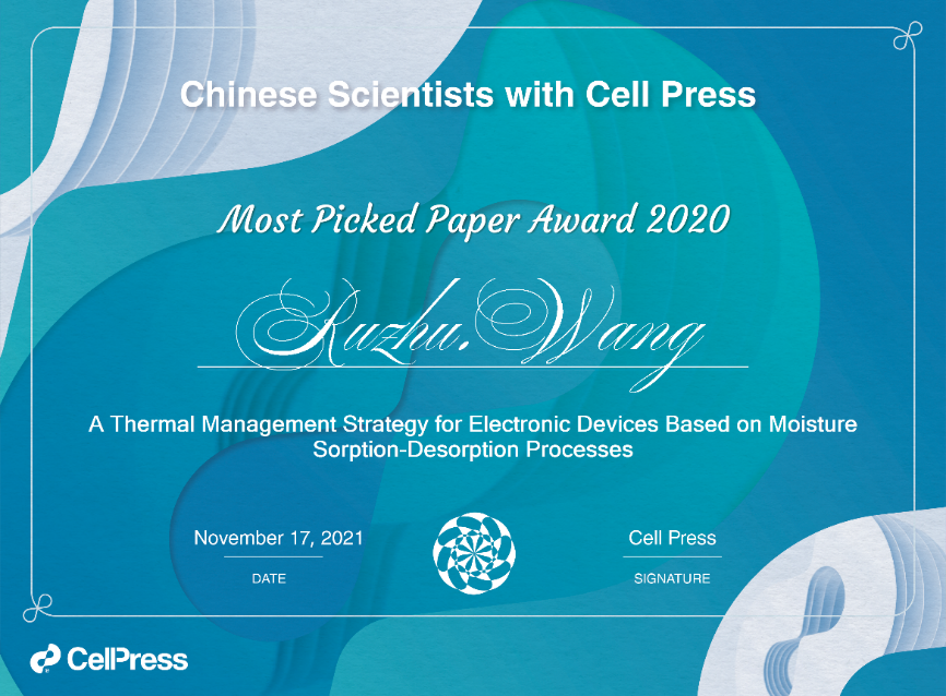 11月17日,Cell Press 2020年度最受欢迎中国论文正式揭晓,王如竹教授团队在Joule上发表的论文“A Thermal Management Strategy for Electronic Devices Based on Moisture Sorption-Desorption Processes”获选,是上海交大唯一获选的论文。论文第一作者是365英国上市公司官网博士研究生王晨曦,王如竹为通讯作者。