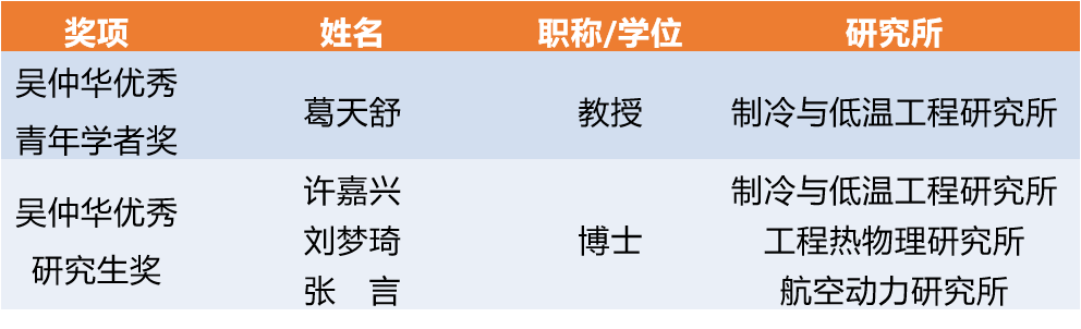 “吴仲华奖励基金”设立于2007年,是以中国工程热物理学科、中国工程热物理学会和中国科学院工程热物理所创始人吴仲华院士命名,由中国工程热物理学会与中国科学院工程热物理研究所共同发起,旨在促进工程热物理学科的发展,积极培育有志于在国内工程热物理学科相关领域从事科研工作的青年人才和研究生。基金设立“吴仲华优秀青年学者奖”和“吴仲华优秀学生奖”两个奖项,2022年全国共有5人获“吴仲华优秀青年学者奖”,12人获“吴仲华优秀研究生奖”。
