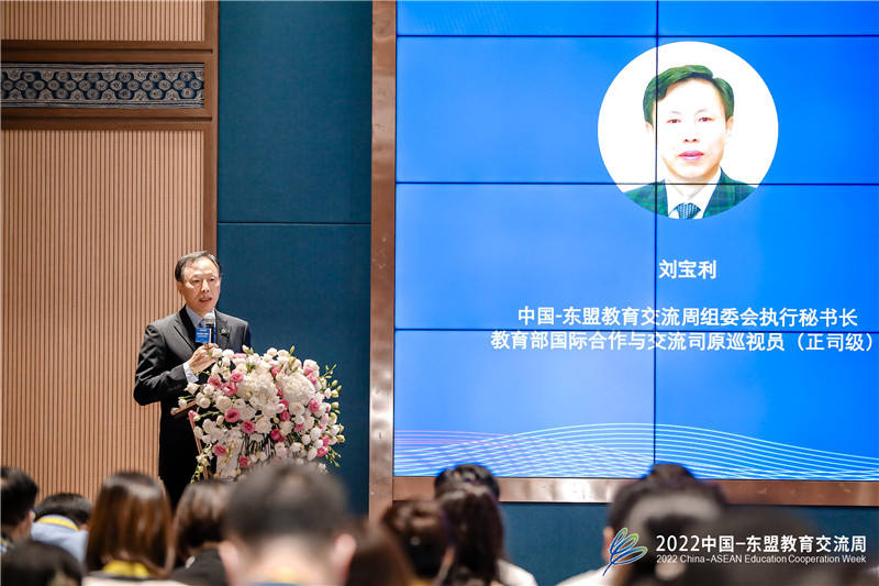 刘宝利代表中国-东盟教育交流周组委会致辞,指出交叉学科建设符合国家的重大战略需求,也符合区域合作和全球化的发展需求,多学科交叉会聚与多技术跨界融合将成为常态,不断催生新学科前沿、新科技领域和新创新形态,提倡教育工作者从促进国际化合作交流、促进优质资源整合、探索跨学科教育新模式三方面出发,推动交叉学科建设与人才培养。