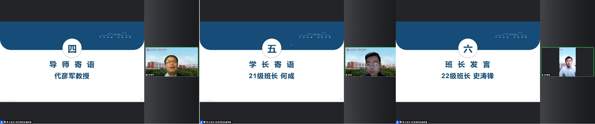 导师代表代彦军教授建议工程博士生明确自身定位、注重阶段性总结,尽早转入学生角色,顺利完成学业。在读生代表、2021级班长何成分享了学习经验。新生代表、2022级班长史涛锋表示将和班委一道积极提升班级凝聚力,推动大家共同成长。