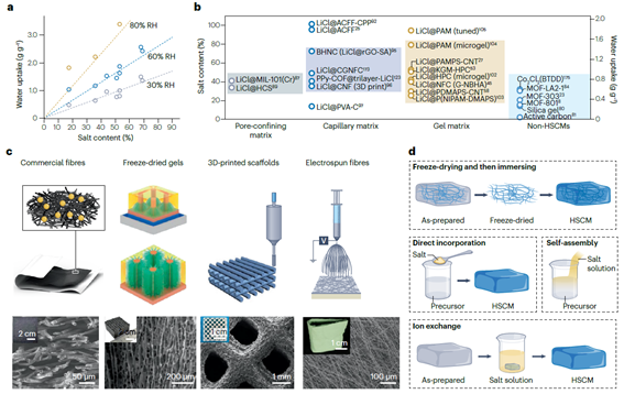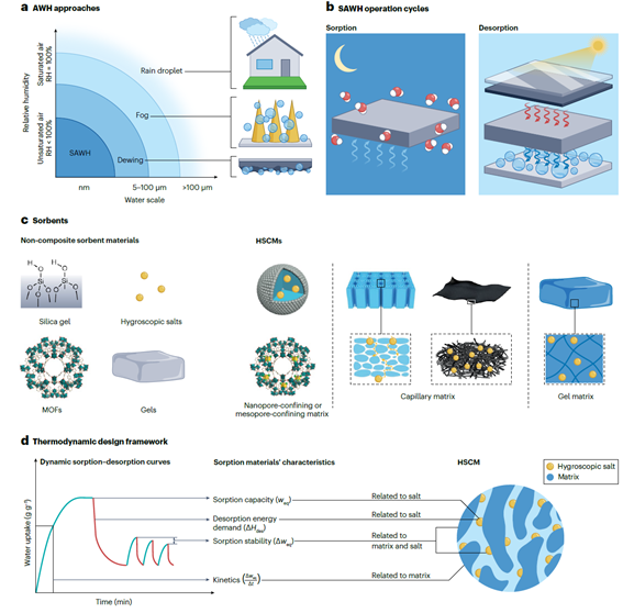 近日,365英国上市公司官网王如竹ITEWA创新团队在Nature Reviews Materials上发表题为“Hygroscopic salt-embedded composite materials for sorption-based atmospheric water harvesting”的综述论文,从热力学角度分析了用于空气取水的吸湿盐掺杂复合吸附剂中吸湿性盐、水和盐溶液之间的相互作用关系,建立了吸湿盐类型与含量、孔隙结构和基质承载能力等结构参数与最终材料性能之间的联系,总结性地提出了指导吸附剂吸附量、解吸焓、动力学和稳定性的理论设计框架,为空气取水及相关领域中吸附材料的设计提供统一验证与调控新方法。365英国上市公司官网-新加坡国立大学联授学位博士生山訸为论文第一作者,王如竹教授、新加坡国立大学陈瑞深副教授为通讯作者。