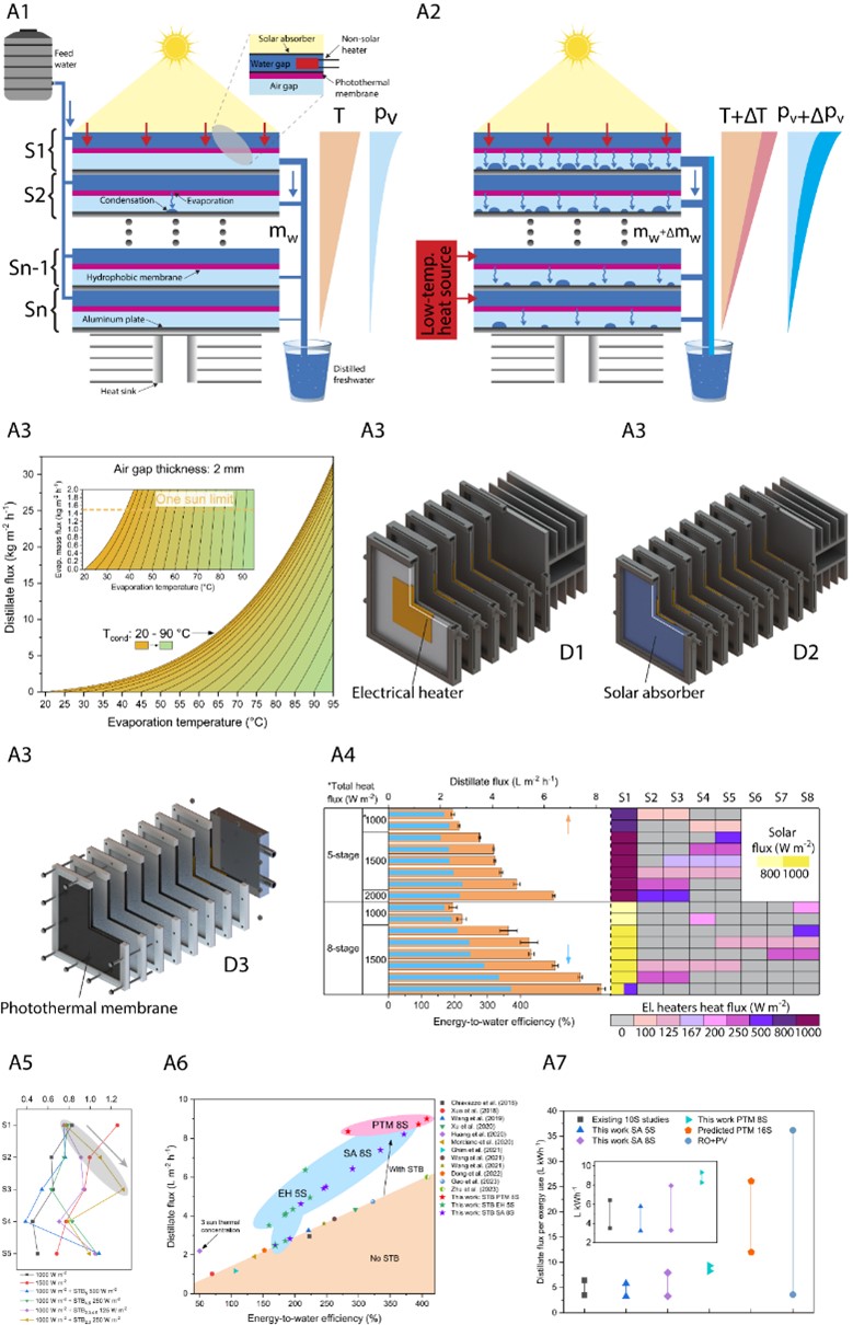 随着气候变化的加剧,人们对水资源安全问题日益关注,水资源问题不仅与生态系统密切相关,还影响到社会、经济的可持续发展。利用可再生能源(如太阳能)实现海水淡化是解决水资源安全问题的重要途径。现有的海水淡化方法中,热驱动的多级膜蒸馏技术近年来愈发受到关注,尤其在材料和系统设计方面取得了显著进展,但该技术仍存在进一步提升的空间:首先,多级膜蒸馏装置中产水速率逐级下降,装置利用率随级数增加而降低,整体产水性能与理论极限相比还有极大的提升空间;其次,需进一步探索在紧凑型膜蒸馏装置中引入额外热源的创新设计方法,并优化装置运行。