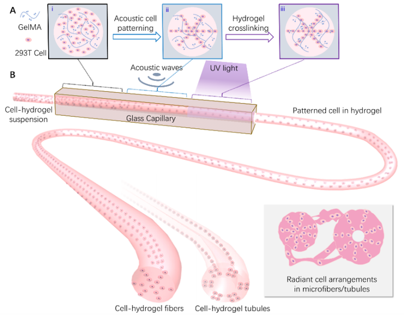 超声细胞图案技术作为一种具有良好生物相容性、灵活可调性和非接触性的细胞操纵方法被广泛应用。然而,辐射状细胞图案作为组织中细胞排布的一种常见方式,如何实现高效定制设计和便捷制造一直都充满挑战。针对上述问题,研究团队设计了一套声流体生物制造系统,可用于生产具有可调谐细胞图案的水凝胶纤维/管。
