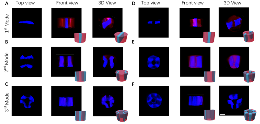 团队利用超声波技术控制细胞-水凝胶悬浮液中的细胞排列,采用毛细管作为超声细胞图案化和水凝胶成形的容器,并在毛细管外部附着压电换能器,换能器产生的超声波引起毛细管共振,同时通过调节超声波的频率和强度,控制毛细管内部的声压分布。细胞-水凝胶悬浮液中的细胞受到声波的作用被驱动到压力节点处,形成相对应的图案。在对细胞辐射状图案的可行性进行分析和验证的基础上,团队将超声驱动细胞图案化技术与微流控生物打印技术相结合,制备了具有图案化细胞结构的微纤维或微管。