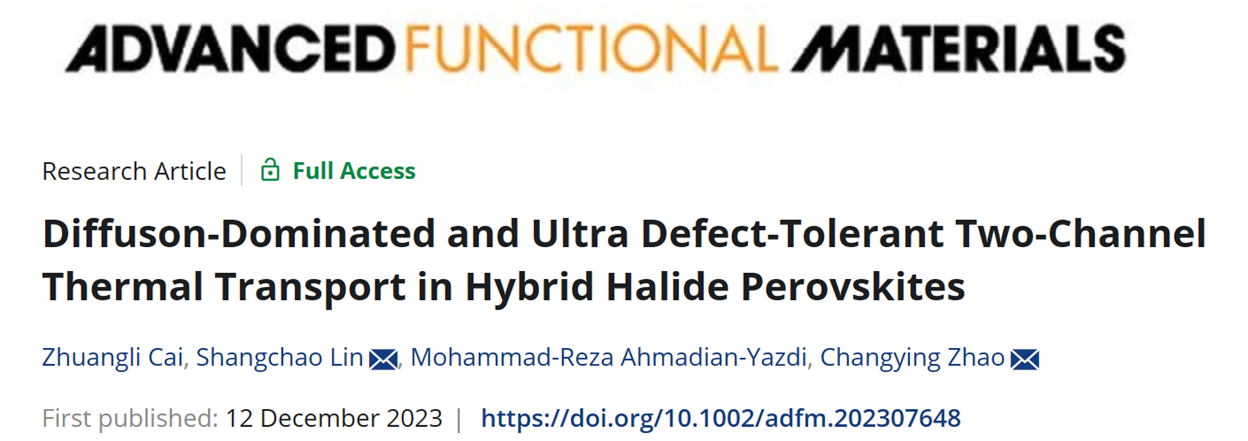 近日,工程热物理研究所林尚超课题组在国际材料领域期刊Advanced Functional Materials上发表“Diffuson-Dominated and Ultra Defect-Tolerant Two-Channel Thermal Transport in Hybrid Halide Perovskites”论文,揭示了杂化卤素钙钛矿中扩散子主导的多通道热输运机理,阐明了其热导率的超高缺陷耐受性机制。工程热物理研究所博士研究生蔡庄立和林尚超副教授为论文共同第一作者,林尚超副教授和赵长颖教授为共同通讯作者。