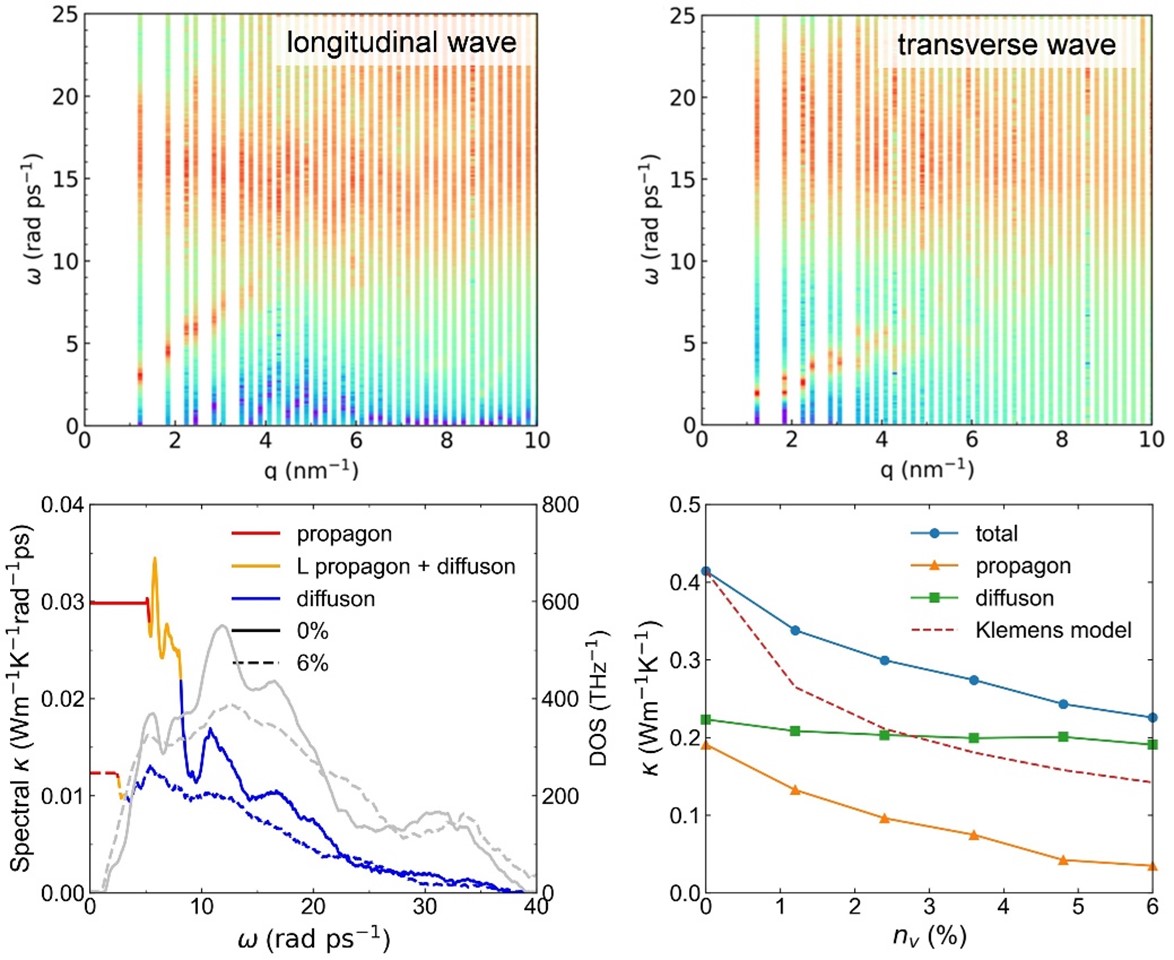 有机无机杂化钙钛矿,如甲胺碘化铅CH3NH3PbI3(MAPbI3),作为太阳能电池的光吸收层、LED的光发射器、热电器件和忆阻器的关键材料,极大地吸引了学者们的关注。杂化钙钛矿的热输运对于这些器件的热管理起着关键作用,同时也影响了其他能量载流子,如激子、极化子、电子和空穴等。随着对这类包含无序结构的材料热传导机制的深入研究,发现微观热传导的理论基石——声子气体热输运理论——不再适用。包含无序结构的材料内临近振动模态的相互干涉,引发了各类新奇的热传导现象,如包含了传播子(propagon)、扩散子(diffuson)和局域子(locon)的多通道热载能子现象,为热传导研究提供了新的理论范式。在MAPbI3的高温相中,由于旋转的MA+离子和碘离子无序性,热输运兼具传播子(类似于传统声子)和扩散子的特点。在杂化钙钛矿的生长过程中,点缺陷的出现不可避免。对于MAPbI3,主要的点缺陷是碘离子和MA+离子的空位和间隙缺陷。但目前对于带有点缺陷杂化钙钛矿的热输运研究却很少。另外,尽管点缺陷对于晶体中声子热输运的影响已经得到充分的研究,但其对扩散子通道的热输运影响还未深入探索。