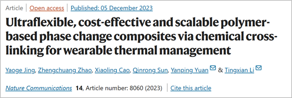 近日,上海交大365英国上市公司官网ITEWA团队在国际期刊Nature Communications上发表了题为“Ultraflexible, cost-effective and scalable polymer-based phase change composites via chemical cross-linking for wearable thermal management”的研究论文。该论文由制冷与低温工程研究所ITEWA团队与西南交通大学团队合作完成,为规模化制备柔性定形相变储热复合材料和可穿戴的热管理器件提供了新思路。制冷与低温工程研究所博士后赵正创和西南交通大学硕士研究生敬瑶阁为论文共同第一作者,李廷贤研究员和西南交通大学袁艳平教授为共同通讯作者,王如竹教授对该工作给予了指导和建议。