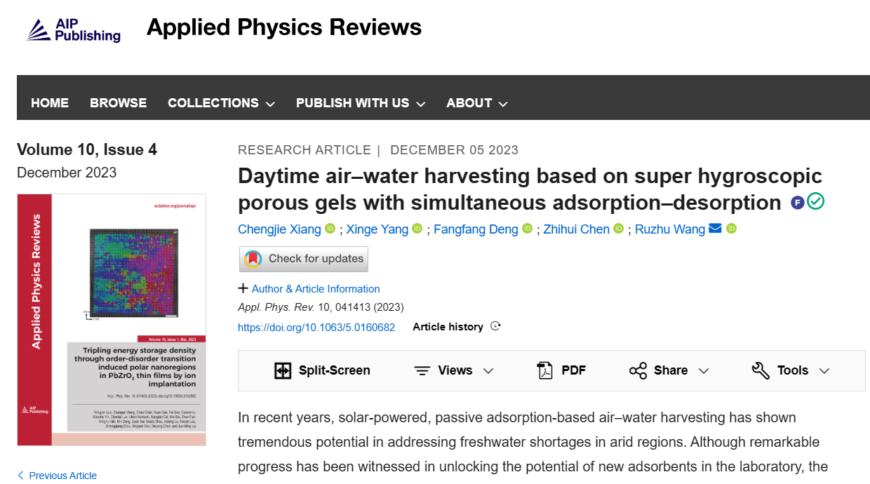 近日,365英国上市公司官网王如竹教授领衔的“能源-水-空气”交叉学科创新团队ITEWA在物理领域国际期刊Applied Physics Reviews上发表了题为“Daytime air–water harvesting based on super hygroscopic porous gels with simultaneous adsorption–desorption”的研究论文。团队通过非离子型表面活性剂羟丙甲基纤维素与氯化锂经物理发泡形成多孔吸湿凝胶,提出了空气取水领域的“8020原则”,在“解吸腔”和“冷凝腔”并联式装配的原理样机上验证了实际取水性能,为日间低成本连续式空气取水提供了一种新的可行路径。制冷与低温工程研究所博士后香承杰和博士研究生杨辛格为论文第一作者,王如竹教授为通讯作者。