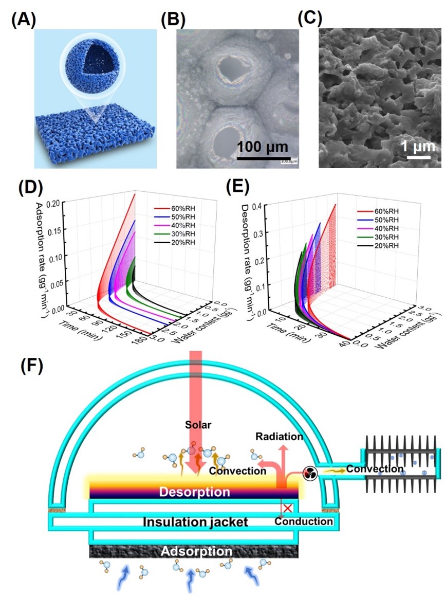 A-C.空心微球多孔吸湿凝胶,D-E.吸附/解吸动力学曲线,F解吸腔/冷凝腔串联的空气取水装置