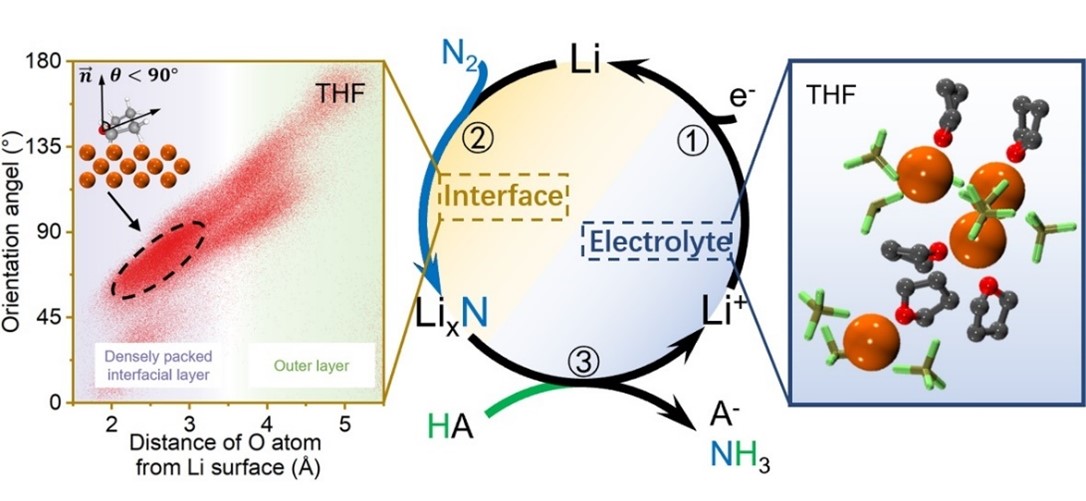 在上述背景下,论文揭示了醚类溶剂在锂介导合成氨反应中关键作用。通过电化学测试,结合分子动力学计算及物理化学表征,研究发现溶剂分子将主导电解液中的锂离子的溶剂化构型,并诱导电极表面形成不同组分和形貌特征的固体电解质界面膜,进而影响体系的导电性、副反应剧烈程度、氨产物分布和法拉第效率。同时,研究还在四氢呋喃溶剂中实现了58.5 ± 6.1%的高法拉第效率,并在二甲氧基乙烷溶剂中实现低极化,高稳定性的连续合成氨。这项工作拓展了锂介导合成氨体系中的溶剂选择,揭示了溶剂的关键作用,并为开发下一代溶剂指明了方向。