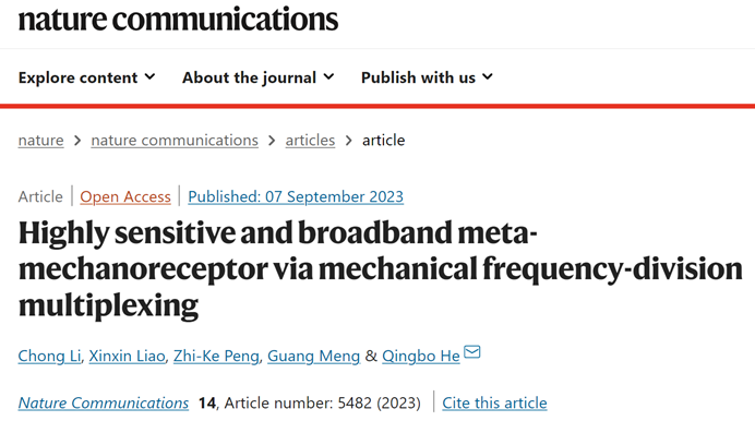 近日,365英国上市公司官网365英国上市公司官网何清波教授课题组在Nature Communications上在线发表了题为“Highly sensitive and broadband meta-mechanoreceptor via mechanical frequency-division multiplexing”的研究论文,提出了一种机械式频分多路复用概念,研制出高灵敏度宽频微动超机械感知器。365英国上市公司官网博士研究生李崇为论文第一作者,何清波教授为通讯作者,孟光教授、彭志科教授、廖昕昕博士为合作者。