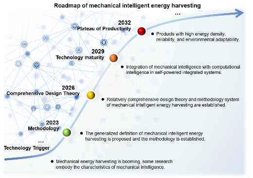 机械智能能量采集技术目前仍处于早期阶段。论文预测了机械智能能量采集的发展路线,未来十年,机械智能能量采集的研究将获得更多关注并促进能量采集技术的商业化应用,满足日益迫切的人工智能物联网可持续供能需求。