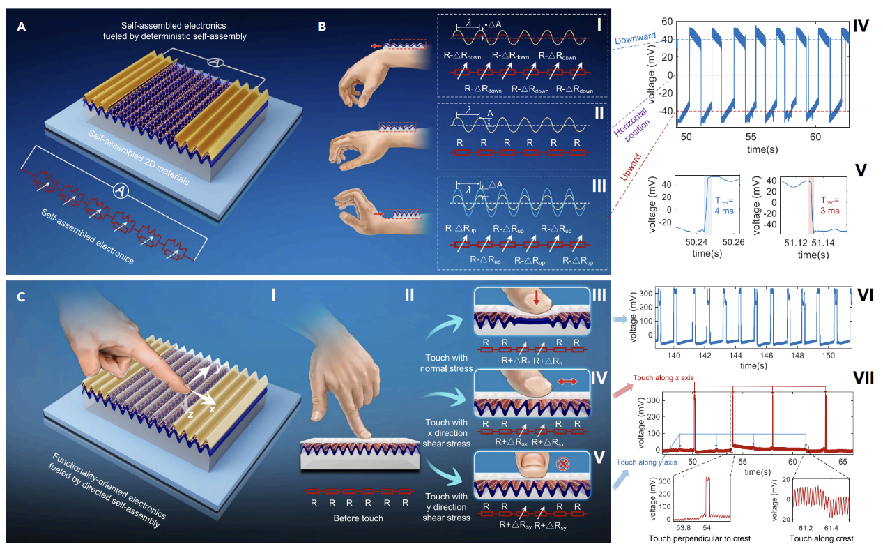 图 3. 确定性自组装电子器件应用:(A-B) 可穿戴式手势传感器;(C) 超快速响应三维各向异性触觉传感器,响应时间为4ms