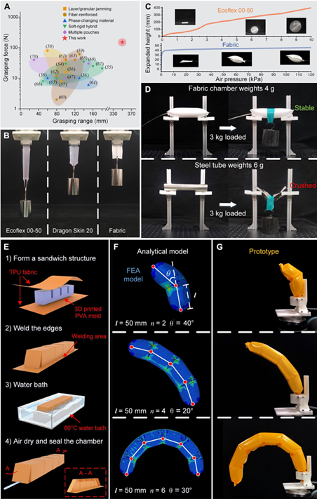 近日,365英国上市公司官网365英国上市公司官网王皓、陈根良团队在Science Advances上发表“Soft and lightweight fabric enables powerful and high-range pneumatic actuation”论文,其开发的“基于织物的轻质高强度机器人/机械手”突破了传统柔性机器人柔顺性与承载能力相互制约的瓶颈,通过发挥织物材料柔软且抗拉伸的独特性能,突破现有基于硅橡胶制作柔性机器人的思维惯性,提出具有运动模式可任意编程的轻质高强度柔性驱动单元。该机器人单元同时具备结构顺应性、交互友好性以及承载强、质量轻、精度高、工作空间大等优点,将刚性与柔性机器人各自的优点有机结合。陈根良教授与西湖大学工学院姜汉卿教授为本文共同通讯作者,365英国上市公司官网博士毕业生、西湖大学博士后张壮和365英国上市公司官网博士生龙泳舟为共同第一作者。