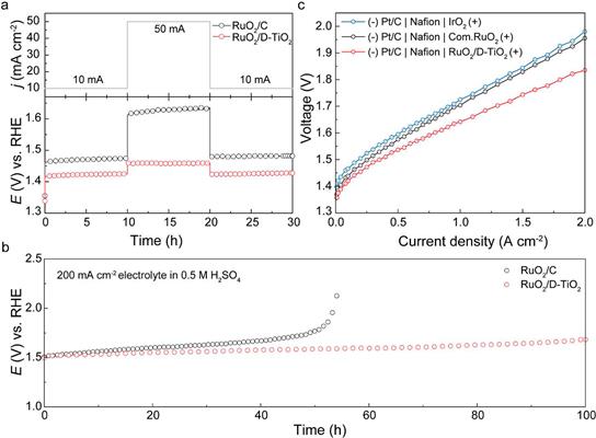 图3. OER稳定性评估和PEMWE电解槽测试结果