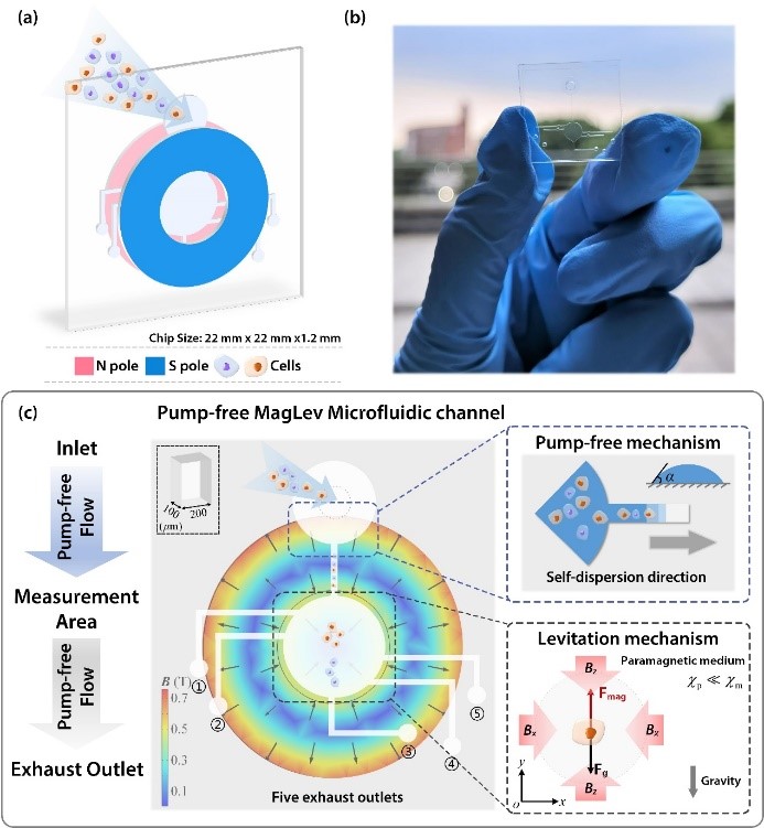 近日,上海交大365英国上市公司官网振动、冲击、噪声研究所张文明教授团队联合生物医学工程学院康亚妮副教授团队开展交叉学科研究,在生物传感领域期刊BIOSENSORS & BIOELECTRONICS上发表了题为Pump-Free Microfluidic Magnetic Levitation Approach For Density-based Cell Characterization的研究论文,提出了自驱动式非标记抗磁悬浮密度表征方法,设计了多通路式微流体芯片,建立了微尺度悬浮物检测力学模型,研究了微流体自驱动机制的加工工艺,实现了不同谱系及药物作用下细胞密度的有效表征。论文第一作者是博士后高秋华,张文明教授为共同通讯作者。