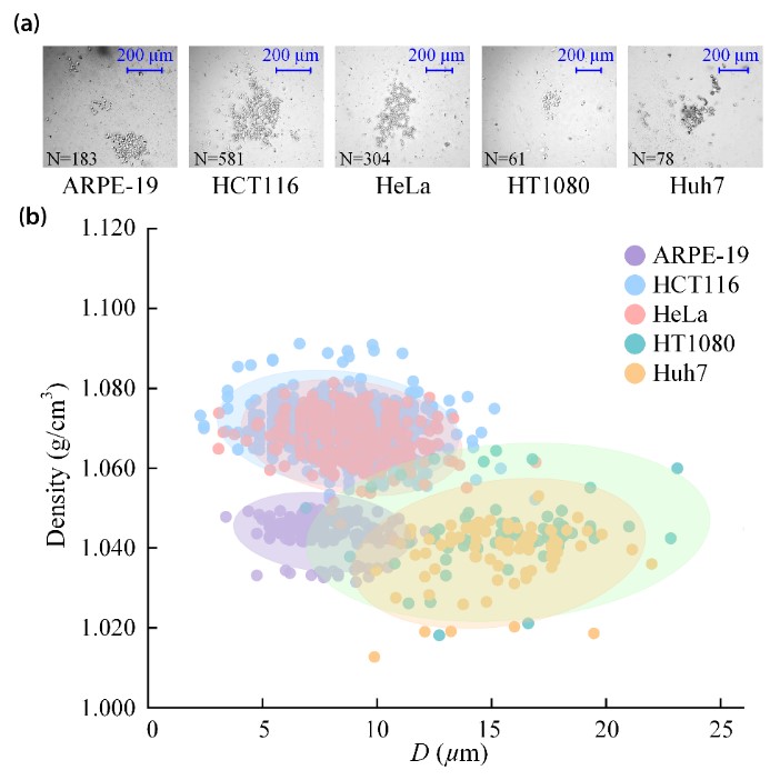为了验证方法有效性,论文分别对来自不同谱系的细胞进行密度表征。结果表明,相比于正常细胞,癌细胞在细胞密度与尺寸方面具有显著的细胞异质性。此外,该方法也可实现不同浓度药物(吉非替尼)作用下肺癌细胞(A549)的密度检测,为癌细胞异质性表征及药物作用效果评估提供了潜在的技术支撑。