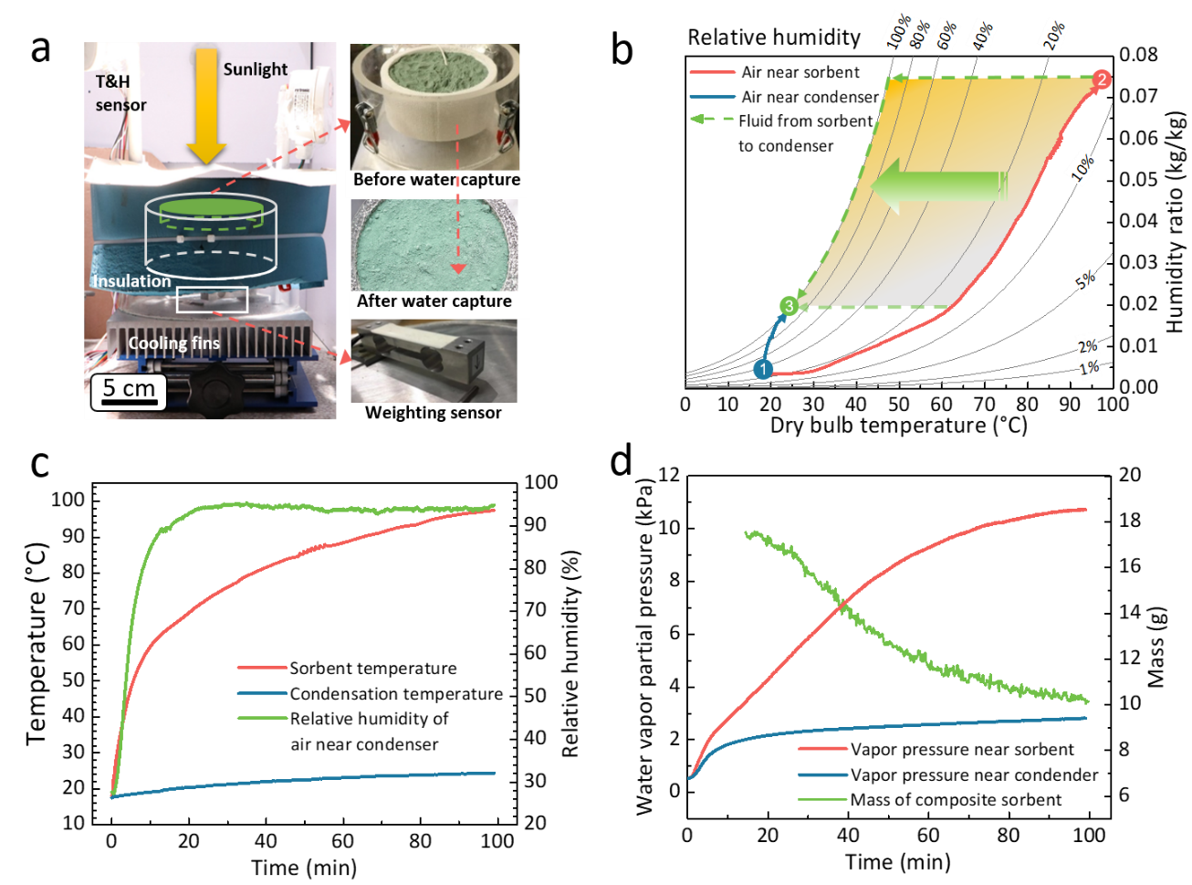 研究团队将制备的复合吸附材料应用在空气取水装置中,实现了在低相对湿度条件下,从干燥空气中快速吸附捕捉水蒸汽与自然光照下的加热脱附收集。该装置单次循环的空气取水量高达0.45~0.70 kg/kg,高于目前国际顶级期刊的报道数据,该方法有望推动基于吸附材料的空气取水技术的发展与商业化应用。