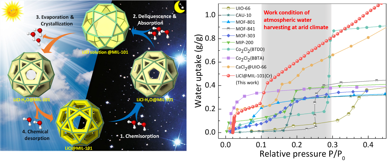 近日,制冷与低温工程研究所王如竹教授和李廷贤副教授等组成的能源-空气-水ITEWA创新团队在化学领域期刊《德国应用化学》(Angewandte Chemie International Edition)上发表了题目为“Efficient Solar-driven Water Harvesting from Arid Air with Metal-organic Frameworks Modified by Hygroscopic Salt”的热点研究论文,针对干旱地区缺水难题,开发了基于金属有机骨架材料(MOFs)的新型复合吸附材料,应用在空气取水装置中,实现了从空气中吸附收集液态饮用水,具有效率高、零耗能、循环稳定性好等优势。本文第一作者是制冷所博士研究生许嘉兴和李廷贤副教授,通讯作者是李廷贤副教授和王如竹教授。