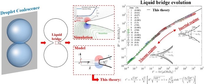 液滴融合在自然界和工业应用中常常起到至关重要的作用,例如雨云的形成以及火箭中燃料的喷雾混合等。如今,科学家们借助高速相机已经能够清晰捕捉液滴融合中转瞬即逝的“液桥”增长过程。研究发现,“液桥”的增长分为两个不同的区间,在每个区间满足不同的增长规律。当液滴较小或者粘性较大的时候,“液桥”随时间线性增长;当液滴较大或者液体粘性较小(惯性较大)时,“液桥”随时间的平方根线性增长。夏溪的研究为这两个阶段的规律提供了统一的理论解释。
