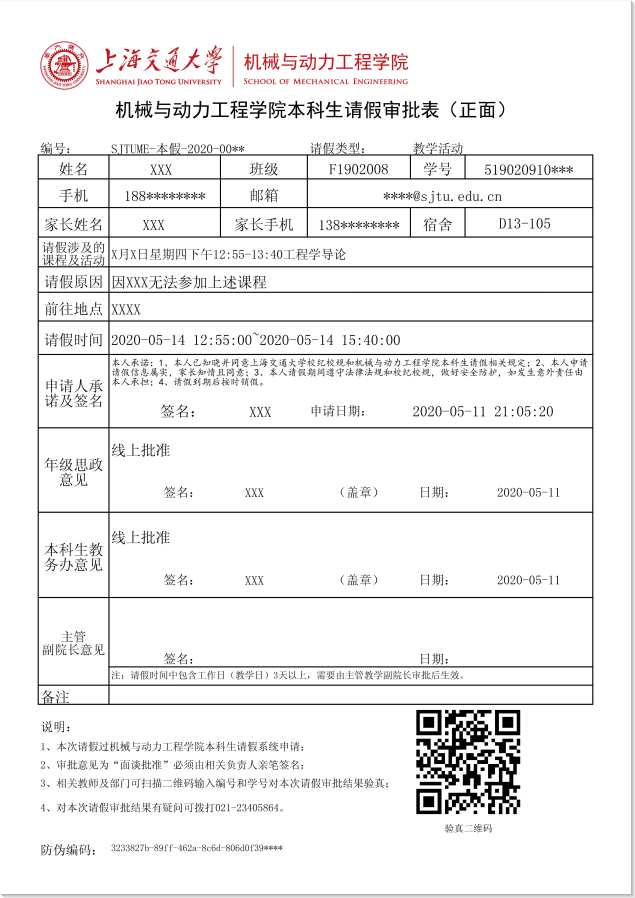 图5 本科生请假审批表(电子版)示意图(正面)