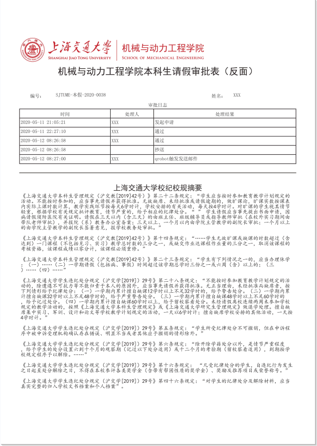 4、请假期间离校的,必须按期返校并登录ssc.sjtu.edu.cn登记销假,因故无法按期返校的,须补充提交请假申请。