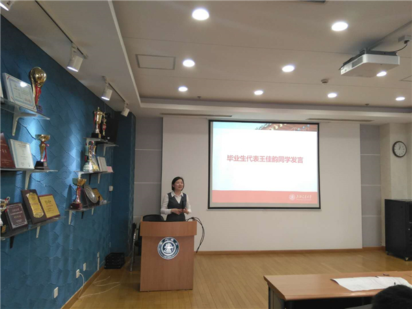 随后,王佳韵同学作为毕业生代表发言。她提出一定要自信,坚信自己的学习平台,坚信自己科研工作的价值,并分享了自己的科研经历以及求职经历,希望作为一位毕业生,与大家共同进步。