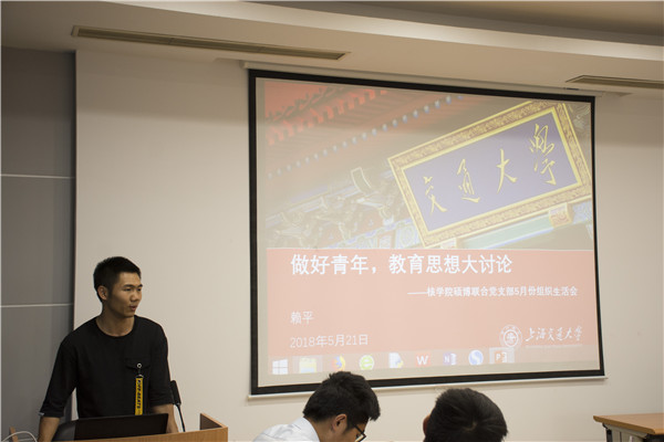 会议伊始,支部首先表扬了胡真,吴建邦,金鹏飞等三名同学,由他们组成的队伍“核平大厦”在机械动力学院第五届党史校史知识竞赛中获得了季军。之后,赖平带领大家温习了习近平总书记在北京大学师生座谈会上的讲话。他用许多例子和名言警句详细阐述了习近平总书记对广大青年提出的四点希望:要爱国,忠于祖国,忠于人民;要励志,立鸿鹄志,做奋斗者;要求真,求真学问,练真本领;要力行,知行合一,做实干家。然后他回顾了前面四次“教育思想大讨论”,并就这次“教育思想大讨论”的几个议题让大家讨论。