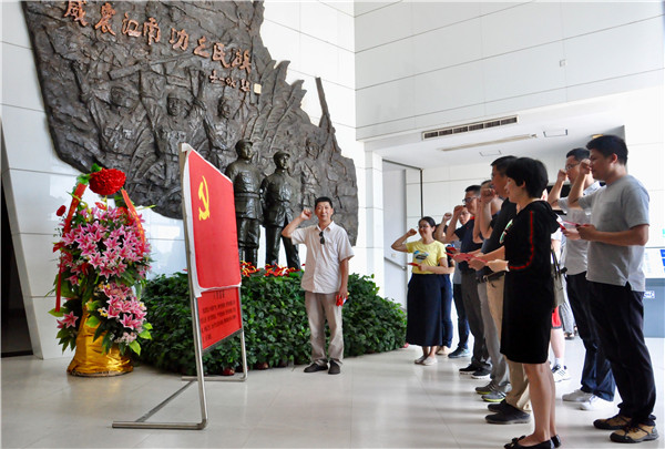 不忘初心,重温入党誓词。在新四军江南指挥部纪念馆,支部党员面对鲜红的党旗郑重宣誓,明确党员义务,牢记对党的承诺。参观馆内陈列的大量珍贵革命文物和图片史料,大家重新感受了新四军江南指挥部在陈毅、粟裕等率领下,深入敌后、不畏艰难,开创和发展以茅山为中心的苏南抗日根据地的战斗历程。