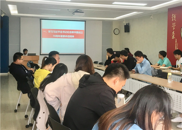 会议首先组织全体党员集中观看了习近平总书记纪念新中国成立70周年重要讲话的视频资料。习近平总书记深情回望70年前新中国成立这一伟大事件,赞扬70年来全国各族人民取得的令世界刮目相看的伟大成就,宣示前进征程上不断创造新的历史伟业的坚强决心和坚定信心,号召全党全军全国各族人民更加紧密地团结起来,不忘初心,牢记使命,继续把我们的人民共和国巩固好、发展好,继续为实现“两个一百年”奋斗目标、实现中华民族伟大复兴的中国梦而努力奋斗。通过讲话,与会党员都为祖国史诗般的进步由衷礼赞和自豪。大家深刻认识到,党的领导是中国取得成功的根本保证,新时代青年党员要坚决维护习近平总书记核心地位,坚决维护党中央权威和集中统一领导,坚定不移听党话、跟党走。