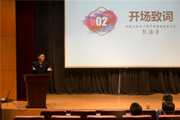 阮海涛为此次大赛致辞,他首先向前程无忧对本次活动的赞助表示感谢,回顾了第一届生涯规划大赛的情况,希望本次大赛也能借游戏形式帮助同学体会大学生涯规划背后蕴含的机理,通过“玩”来更好地了解自身,了解生涯规划并开始合理规划自己的大学生涯。随后裁判长郑泽媛介绍了大赛要点,对注意事项进行了详细解说,使选手们对比赛有了更好的理解。