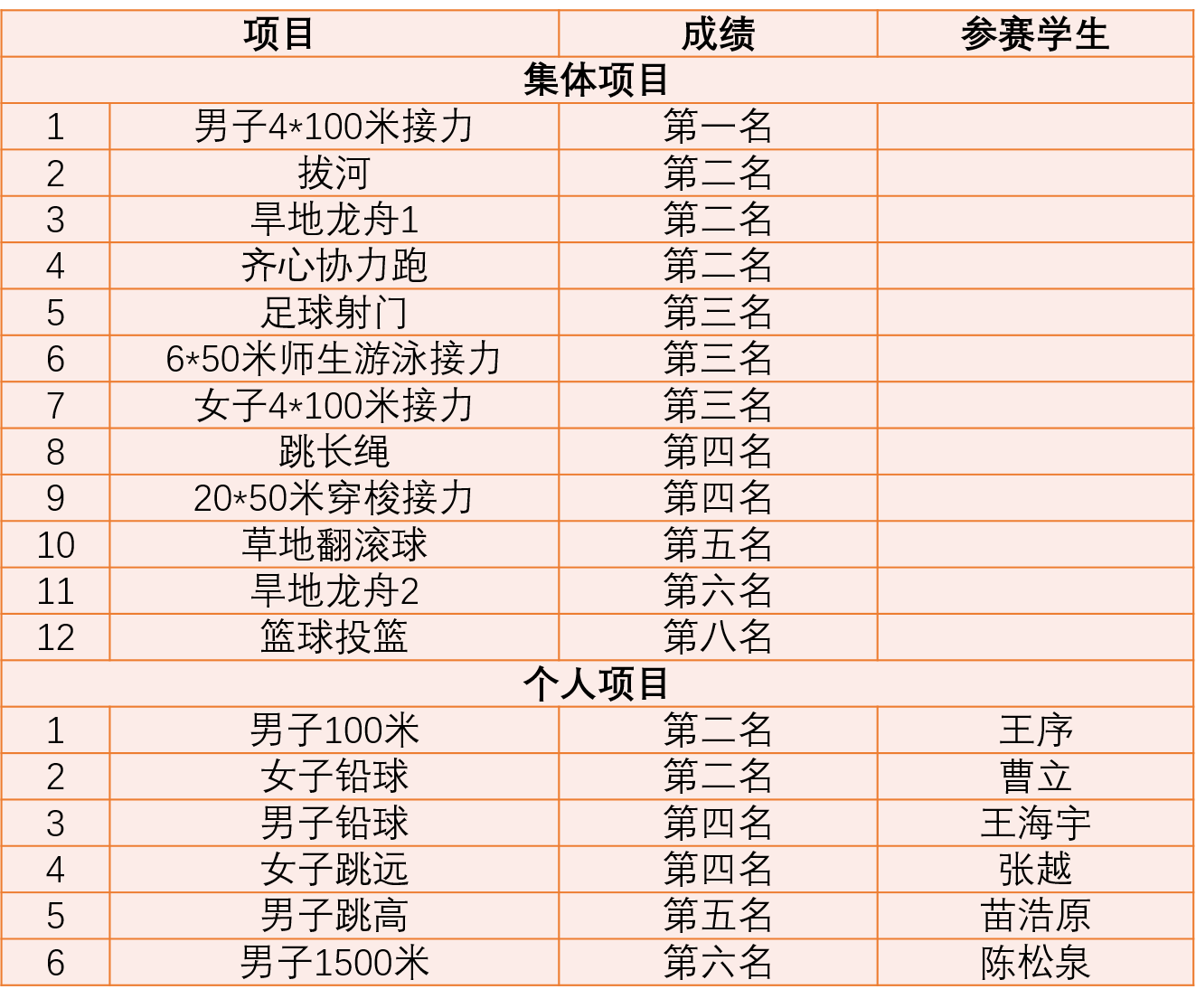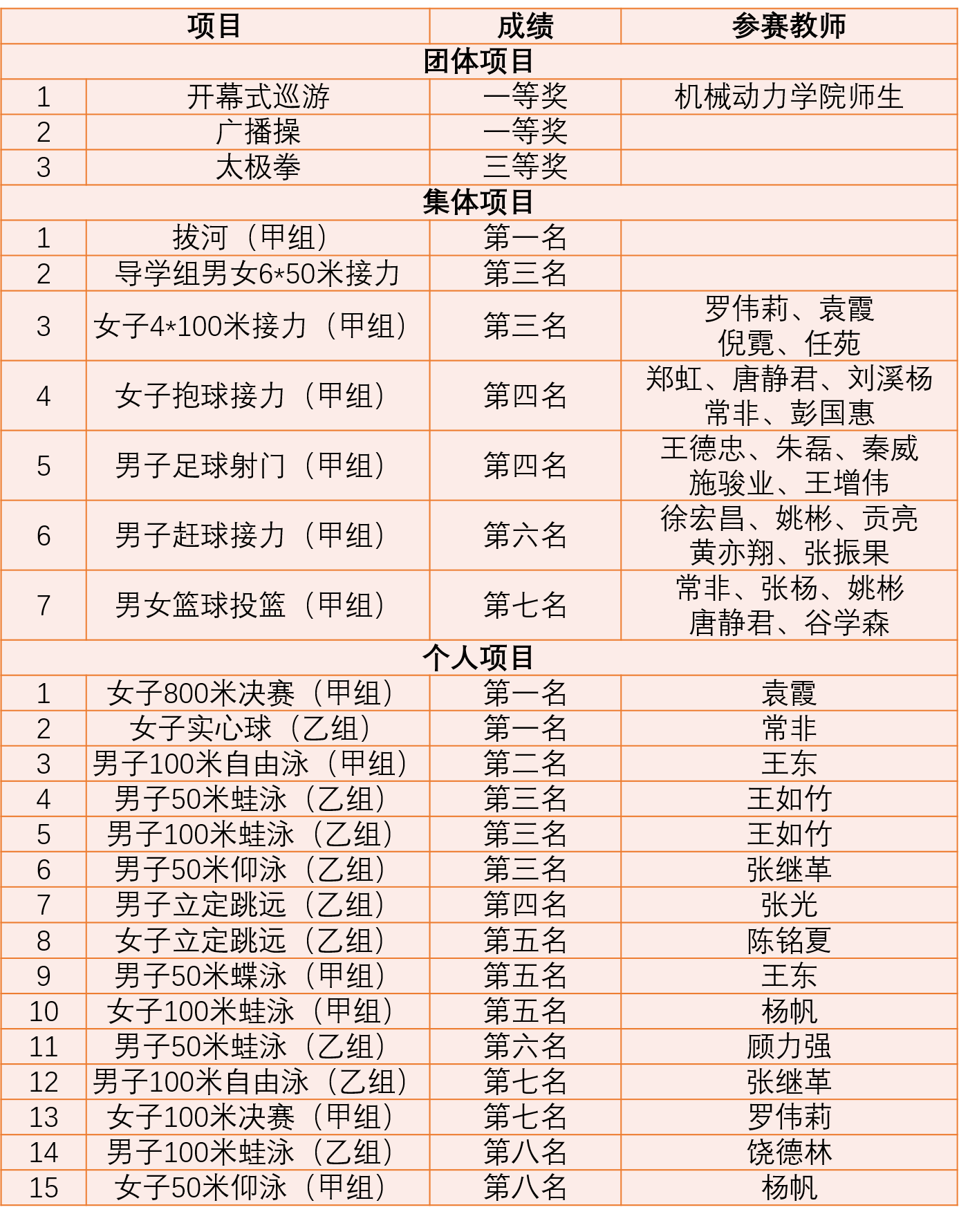 集体项目和个人项目中,学院教职工在拔河比赛、女子800米、女子实心球投远中奋力拼搏,勇夺冠军,学院学生在男子4*100米接力中获得第一名。此外,365英国官网师生在立定跳远、足球射门、男子50米蝶泳、女子100米等比赛中也获得了较好成绩。