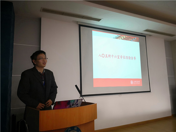 八〇五所十六室党支部优秀党员孙培杰师兄进行了经验分享。孙学长说主动性是学习科研工作能够顺利完成的重要因素。在学习和课题研究中,主动对于创新点进行提炼,主动对观点或者想法进行实验验证,才能够确保课题顺利完成和顺利毕业。在学生时代,通过课题研究养成良好的主动性,将使我们在以后的工作中受益良多。