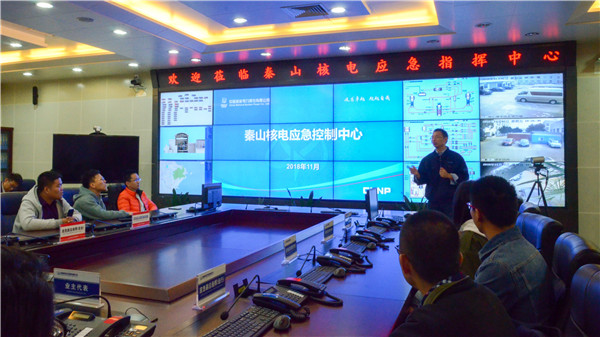 上午10点,天气晴朗,海风徐徐,同学们来到了参观的第一站:秦山核电应急指挥中心,秦山核电环境应急处科长周国华为同学们以及华东站的同志们进行了讲解。秦山核电应急指挥中心是2011年福岛事故发生后,秦山核电在国家的号召下建立的事故预防和处理的重要枢纽,于2013年投入使用。指挥中心壮观大气,功能齐全,一层被整体架高2.4米,可有效抵挡海啸,台风和地震袭击。应急指挥中心具有完备的事故处理预防设施,包括对运行情况和放射性的实时监测,海事卫星电话,同步视频系统,应急柴油发电机,50吨生活水箱,UPS电源等,这些设施确保了指挥中心在事故情况下的正常运作。秦山拥有中国核电站最大规模的应急组织,共692人,15分钟内即可把异常信息发给国家核事故应急协调委员会和各级相关组织,能够应付核电站出现的任何突发情况,为核电站周边居民和环境的安全提供了有力的保障。同学们也同现场的应急指挥工作人员进行了交流互动,工作人员针对核电站换料方案,应急中心经历过的紧急情况等做出了解答。