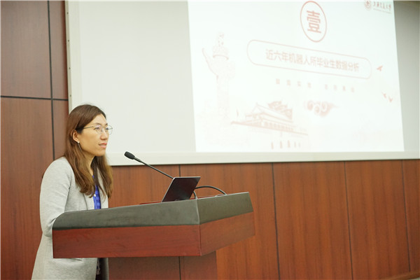 郭莉首先向与会师生介绍了2019届机器人所毕业生的情况,并分析了近六年系所毕业生的就业类型,超过三成的毕业生选择进入学校引导目录单位就职。她鼓励更多的有志青年去国家急需的行业领域或基层单位建功立业,在实现自我价值的同时发挥交大学子的历史责任感与使命感。