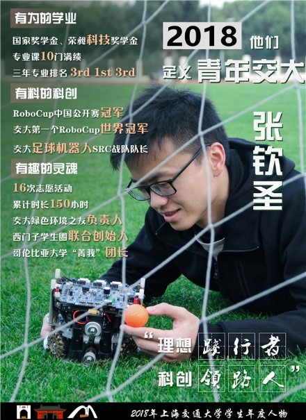 张钦圣创建并担任交大RoboCup小型组队伍SRC队长,带领团队在2017年名古屋世界杯中斩获交大历史上第一个RoboCup世界冠军,随后又带领团队获得RoboCup2018年中国公开赛冠军。他投身智能机器人领域,参与了仙知机器人AGV无人车开发,成功在2018中国国际工业博览会展出。张钦圣还曾以专业前三的优异成绩,获国家奖学金、荣昶科技奖学金等荣誉。