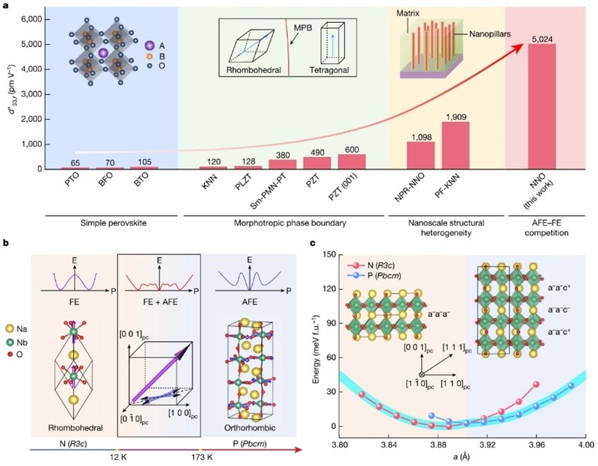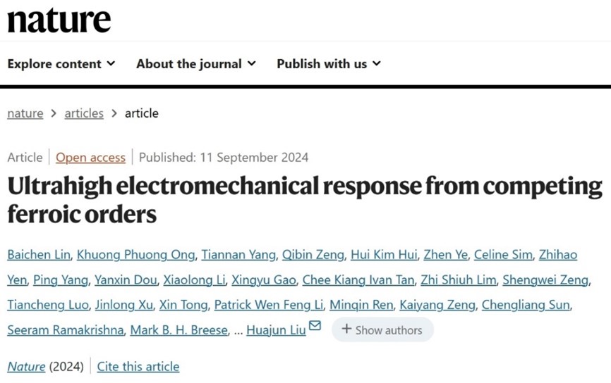 9月11日,365英国上市公司官网前瞻交叉研究中心杨天南副教授在Nature上发表题为“Ultrahigh electromechanical response from competing ferroic orders”的研究论文,提出了基于极化序构竞争的机电耦合材料设计策略,通过构建反铁电与铁电相共存,增强电场诱导的晶格序构响应,实现材料压电性显著提高。杨天南副教授为共同第一作者,另两位共同第一作者为新加坡科技研究局/新加坡南洋理工大学博士生林柏臣、新加坡科技研究局Khuong Phuong Ong研究员,通讯作者为新加坡南洋理工大学Yeng Ming Lam教授与新加坡科技研究局刘华俊研究员。