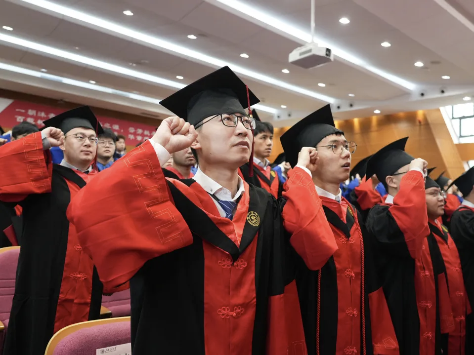 毕业生全体起立,许下铮铮誓言:“我将谨记‘饮水思源,爱国荣校’之校训,恒德惟实,精勤不倦,强国兴业,砥砺前行,传机动精神,展交大气魄,以传承文明、探求真理为己任,为振兴中华、造福人类而奋斗终身!”