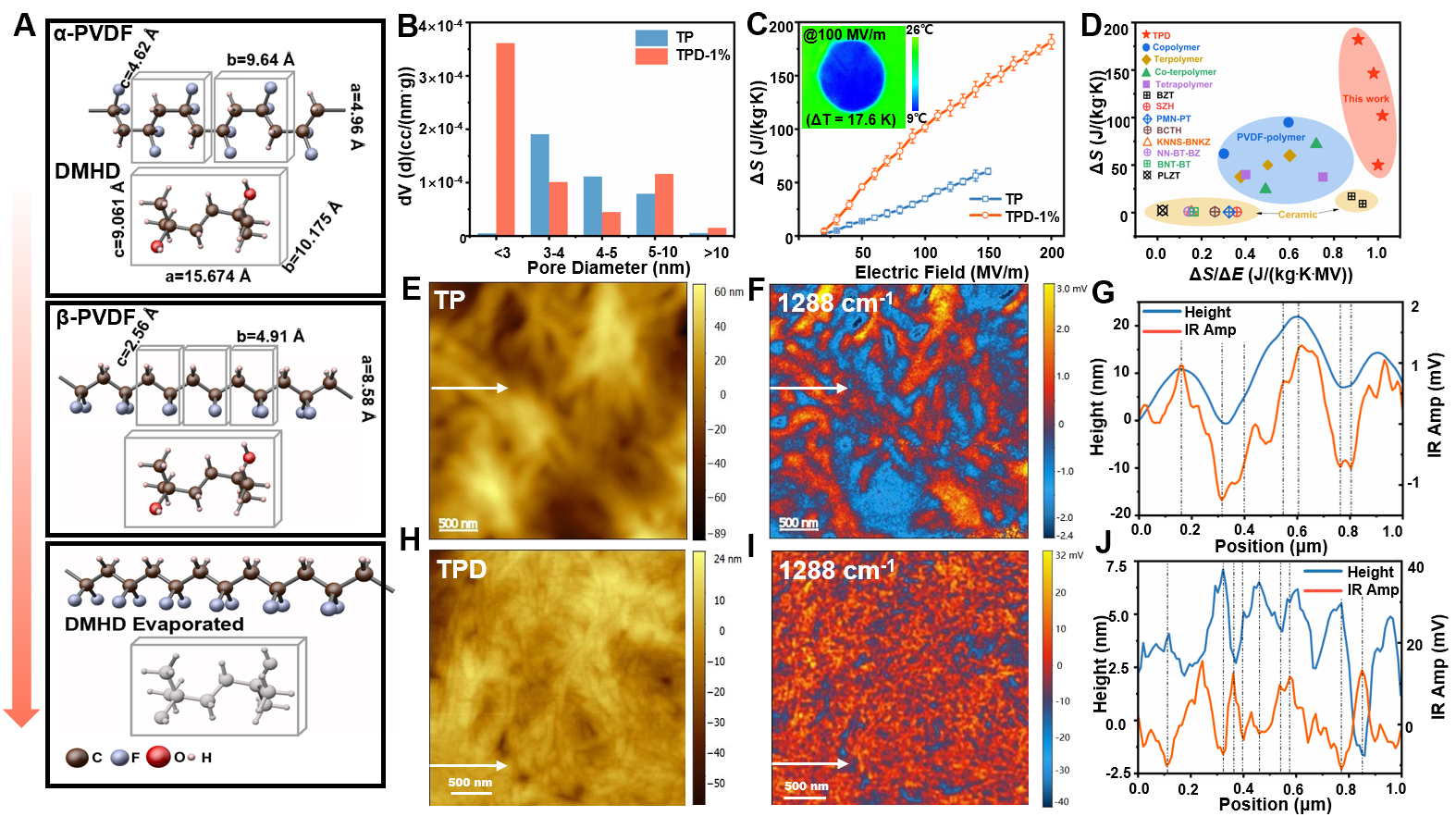 论文利用小分子自身的低沸点特性和与聚合物良好的相容性,在真空热退火中,小分子从体系中完全蒸发,留下大量分散均匀的亚纳米尺寸的孔。利用纳米红外表征技术表明纳米孔界面处保留了由于分子间氢键相互作用产生的极性构象,与传统弛豫铁电高分子相比,这些极性构象都出现在晶粒的边缘,而非晶粒的中间。稠密的亚纳米尺寸的二维极性界面取代了百纳米级别的三维极性纳米畴区,成为电卡效应主要的贡献者。无需化学反应的参与,传统的P(VDF-TrFE-CFE)三元弛豫铁电高分子在低电场下的电卡效应提升了300%。