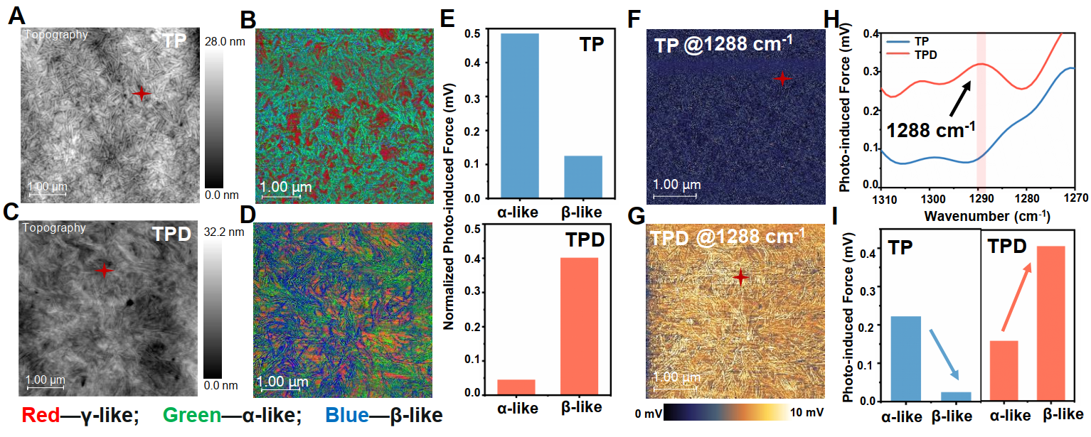 本文首次报道利用光致红外超光谱仪(hyPIR)采集了电卡聚合物1600-780 cm-1光谱范围内的红外吸收化学图像,可以直观研究材料界面增强的极性高熵态和其他聚合物构象。改性样品不仅表现出明显的界面全反式极性构像增强信号,同时形成更多的聚合物构像类型,具有更强的多相共存特性。与普通聚合物相比,TPD样品对电场响应会更敏感,因此具有更强的电卡效应。